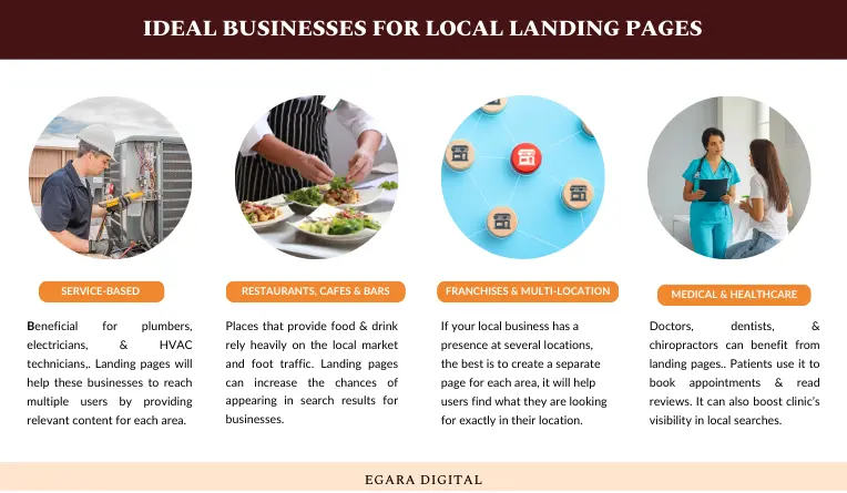 Local seo landing pages can be beneficial for plumbers, electricians, and HVAC technicians. Such service providers have a specific geographical operation area. Landing pages will help these businesses to reach multiple users by providing relevant content for each area.